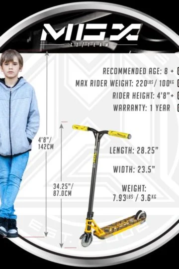 ה-MGX T1 TEAM דגם ה"טים" של MGP מתאים לבנים ולבנות מגיל 8 ועד משקל רוכב מירבי של 100 ק"ג.